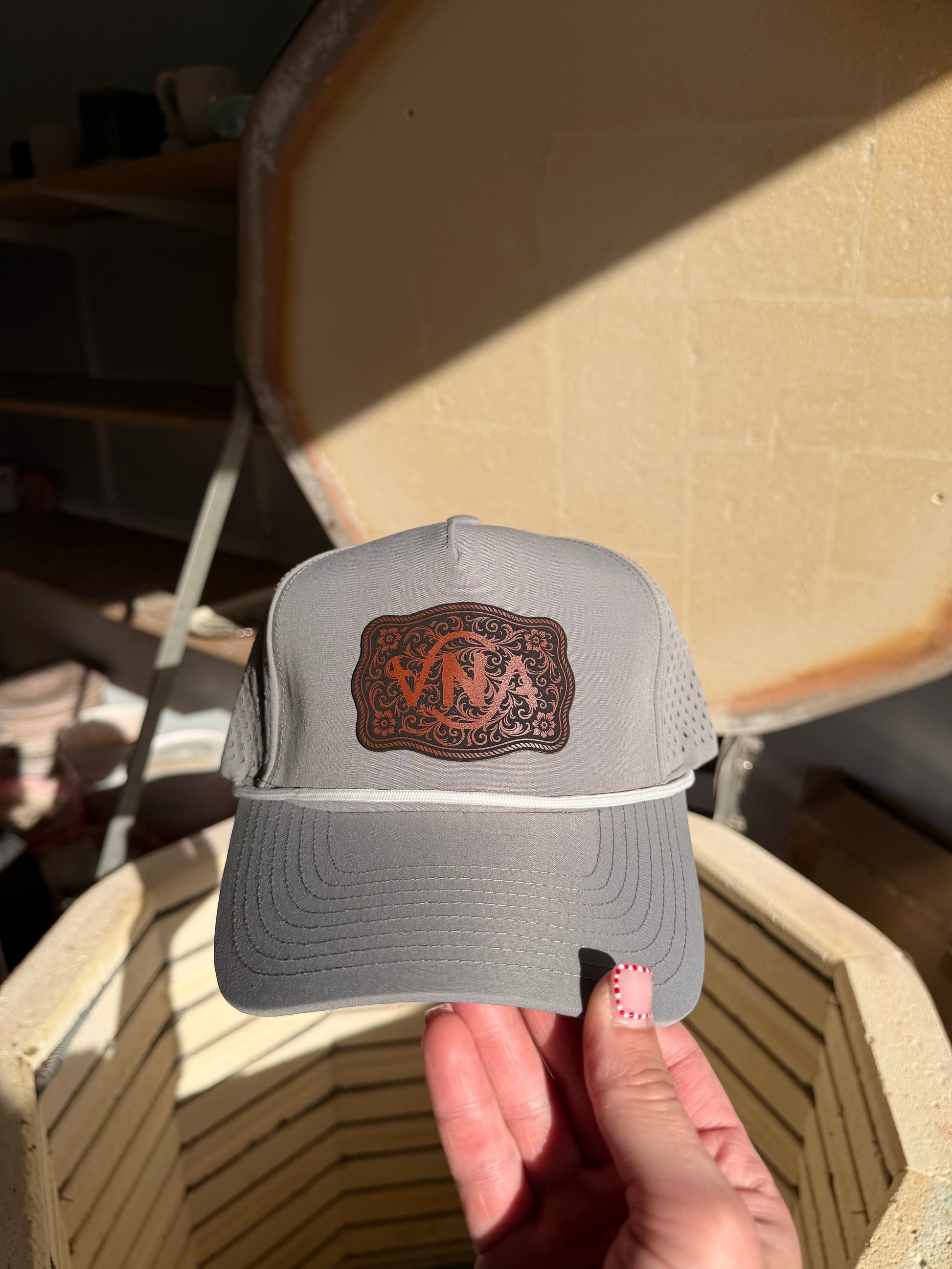 This VNA hat features a custom leather patch designed exclusively for the studio, bringing together craftsmanship, durability, and everyday style. Made to be worn often, the structured fit and adjustable snapback offer comfort and versatility, while the leather patch adds a handcrafted touch that reflects the same care and intention behind our pottery.
